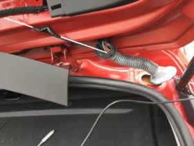 1シリーズはハッチバック車ですので、配線をリアハッチのハーネス蛇腹を通して何とかガラスまでもっていかないといけませんので少々手間です。